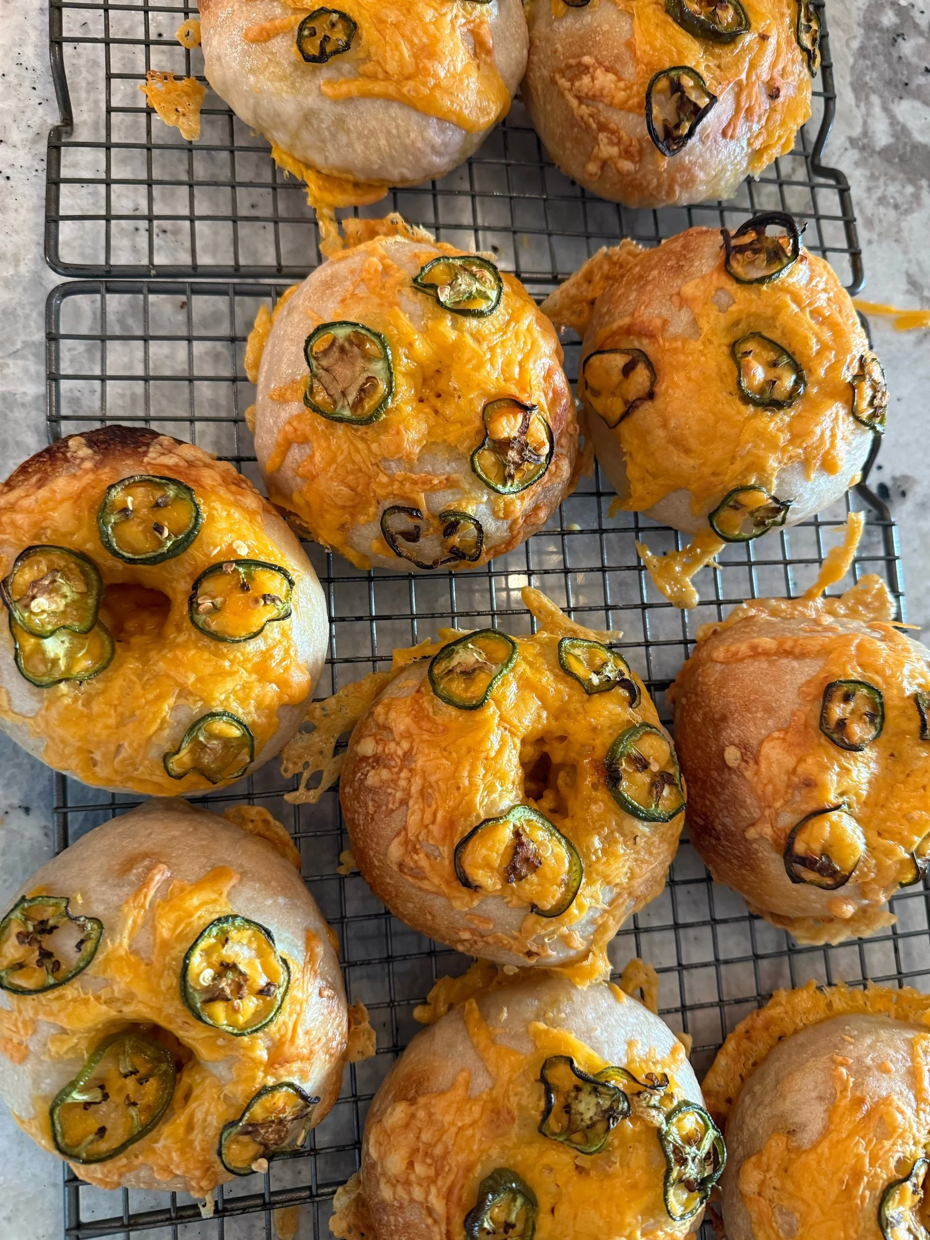 Shop › Jalapeño + Cheddar Sourdough Bagels 6 Count Image 1 of 1 Jalapeño + Cheddar Sourdough Bagels 6 Count $10.00 Bold and flavorful sourdough bagels baked with sharp cheddar and spicy jalapeños for the perfect cheesy kick. Quantity: Add To Cart Added! Bold and flavorful sourdough bagels baked with sharp cheddar and spicy jalapeños for the perfect cheesy kick.